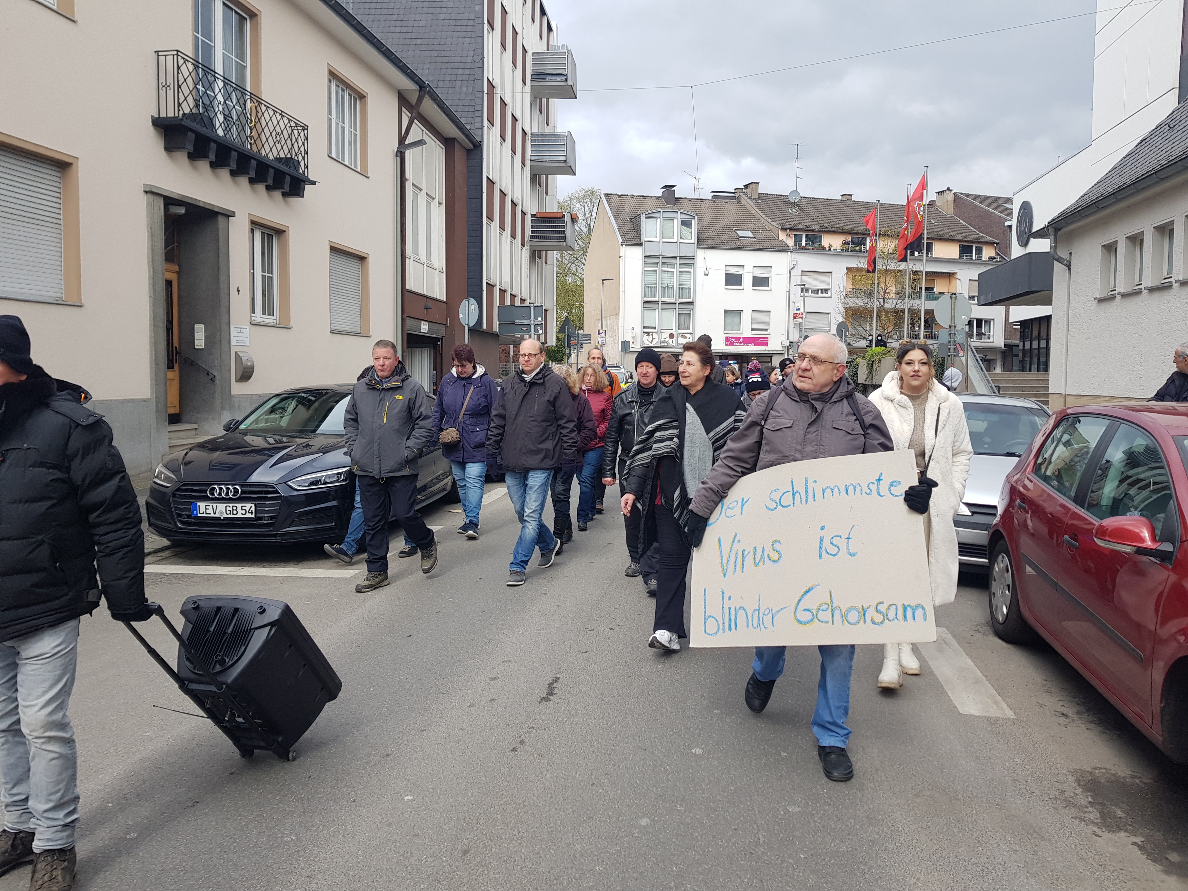Trotz des typischen Aprilwetters versammelten sich am gestrigen Sonnabend noch einmal Leverkusener Mutbürger um ein Zeichen gegen die Entrechtungspolitik der vergangenen zwei Jahre zu setzen. Trotz der aktuellen Lockerungen, die man sonst Gefängnisinsassen zugesteht, gibt es nämlich noch genügend Gründe auf die Straße zu gehen.