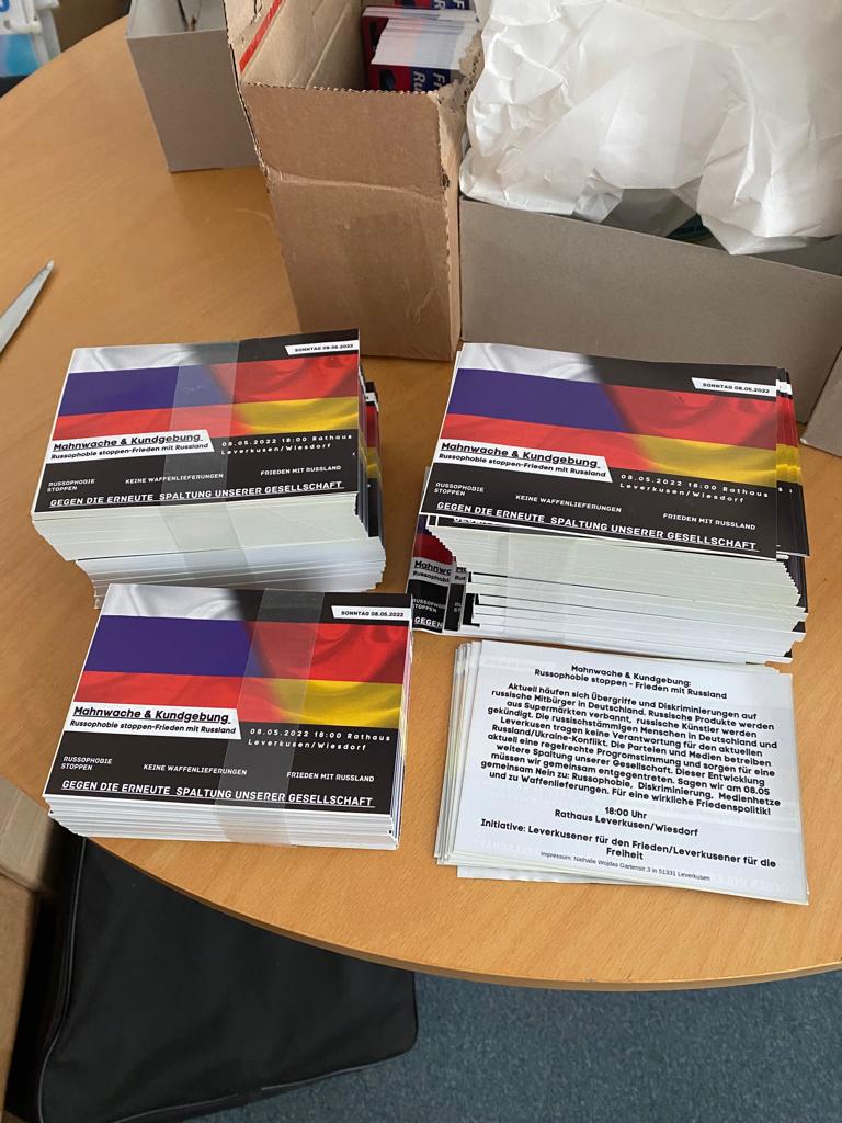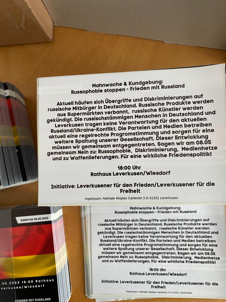 Diese werden nun in den nächsten Tagen in Leverkusen verteilt. Sagen wir gemeinsam Nein zu: Waffenlieferungen, einem eventuellen NATO-Einsatz und zur zunehmenden Russophobie in Deutschland.